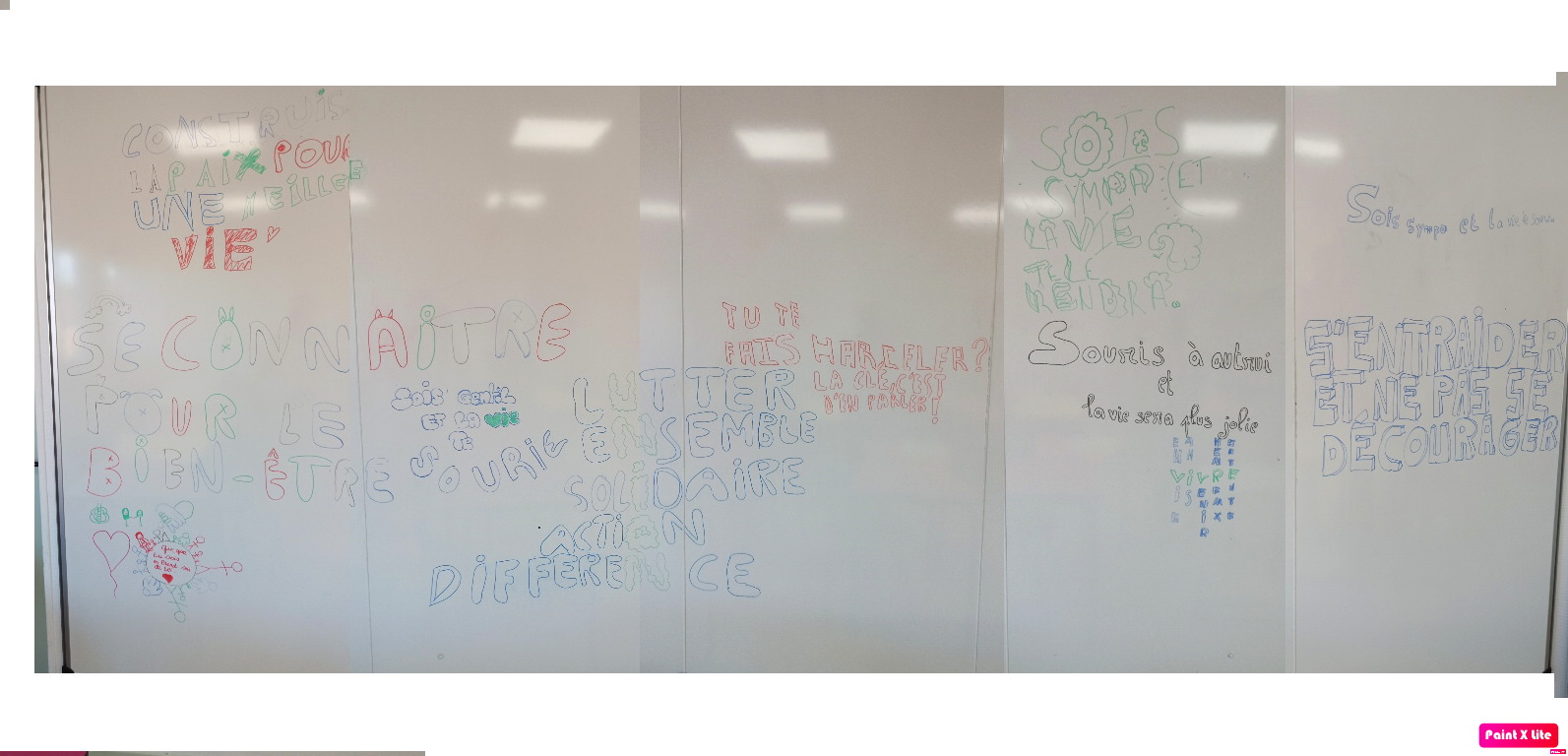 Voici le mur d'expression libre réalisé par les élèves volontaires de tous niveaux dans le cadre de la semaine contre le harcèlement et pour le bien vivre ensemble. Elle est visible en salle Poincaré.