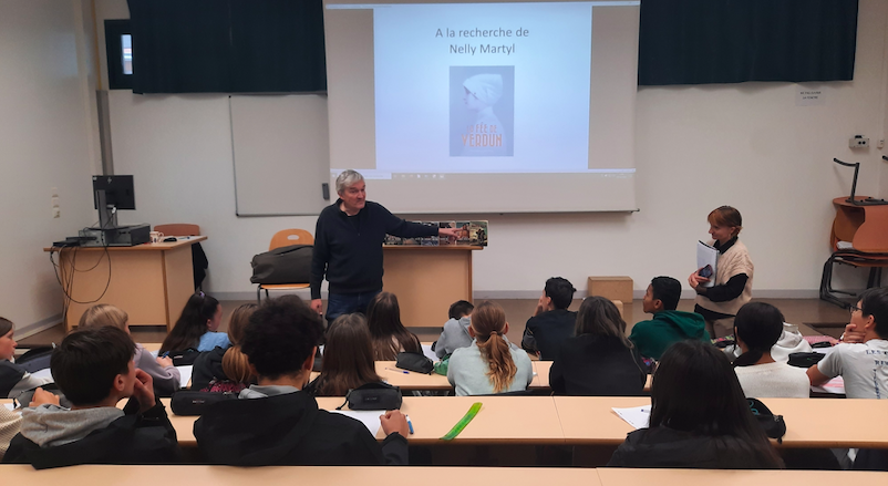 Mardi 3 décembre 2024, dans le cadre du projet Jeunes en Librairie, nous avons rencontré Philippe Nessmann auteur de la Fée de Verdun, venu spécialement de Paris pour nous présenter son métier et ses ouvrages.